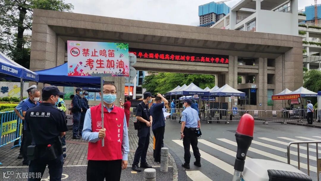 在深圳第二高级中学考点,中建钢构南山科创中心项目党支部高考志愿服务队建立了助考服务站,为广大考生和家长提供矿泉水、口罩、消毒酒精等物资,并配合其他志愿者们积极维护考场周围秩序,为高考考生加油打气。