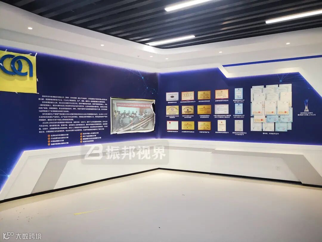 下图展示台放置了多项资质介绍,双屏幕播放着企业宣传影片,展示了山东安车通过不断地科研创新,力求检测数据更为精准,为“国六”标准顺利实施提供了数据支撑,体现了“做一流服务,创一流企业”的理念。