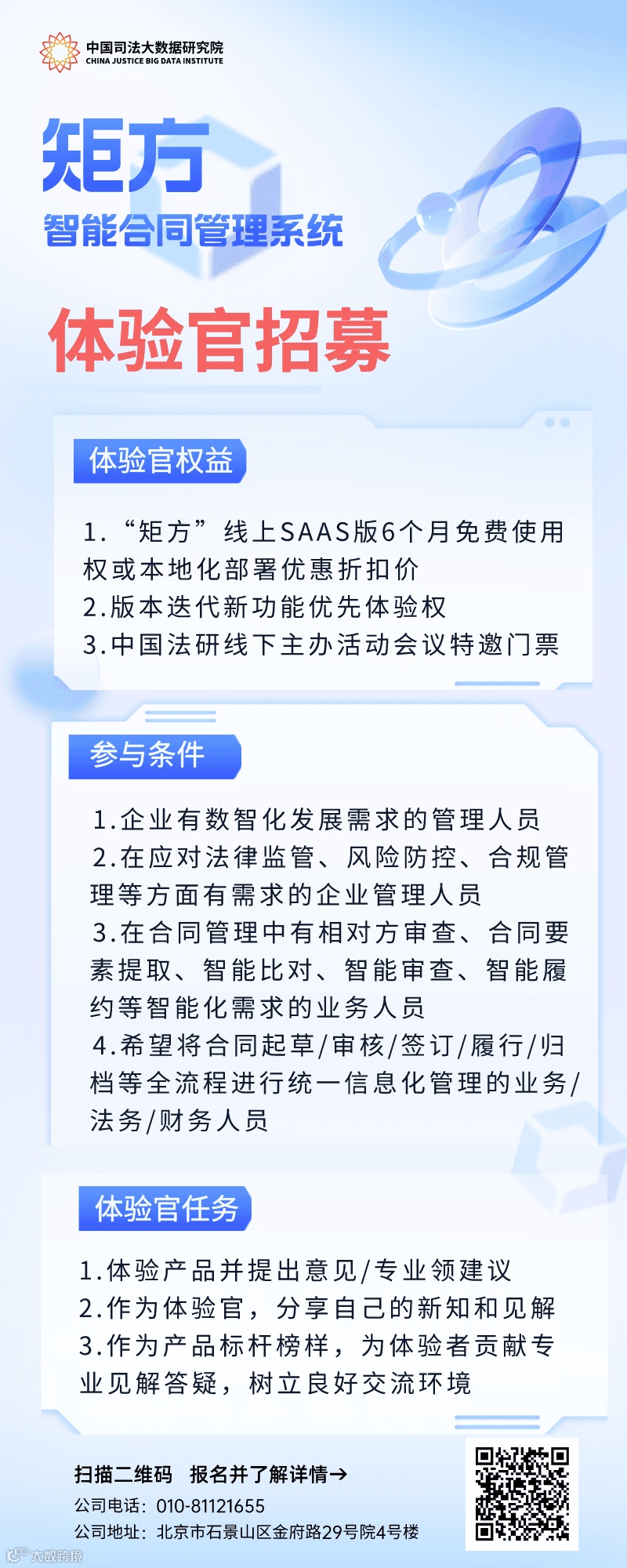 我们诚挚欢迎合同管理领域的业内专家共同参与系统建设,也欢迎对智能合同管理系统有需求的管理及业务人员识别下方二维码报名成为中国法研首批官方体验官。