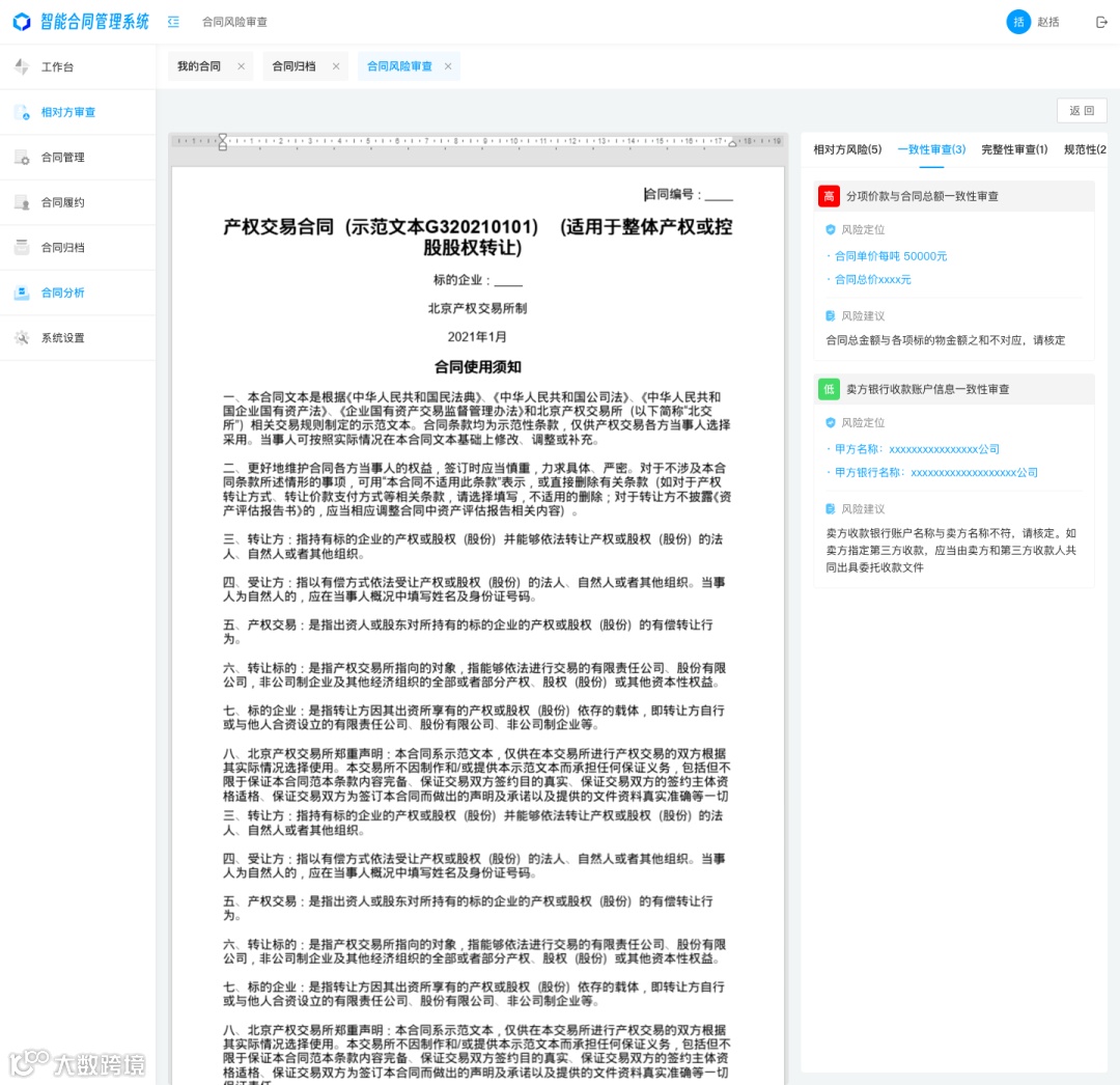 预置风险识别规则,支持对合同内容一致性、完整性、规范性、合理性的智能审查