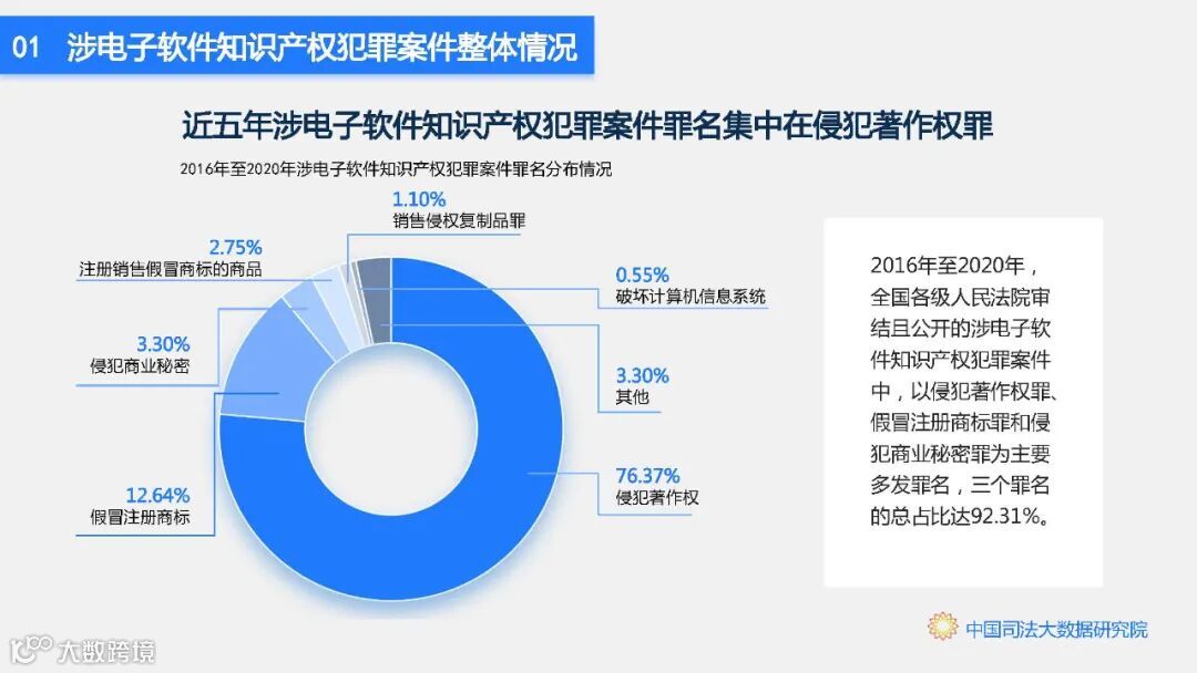 日前,中国司法大数据研究院联合北京市石景山区人民法院共同对外发布《电子软件知识产权犯罪数据分析研究报告(2016.1-2020.12)》。