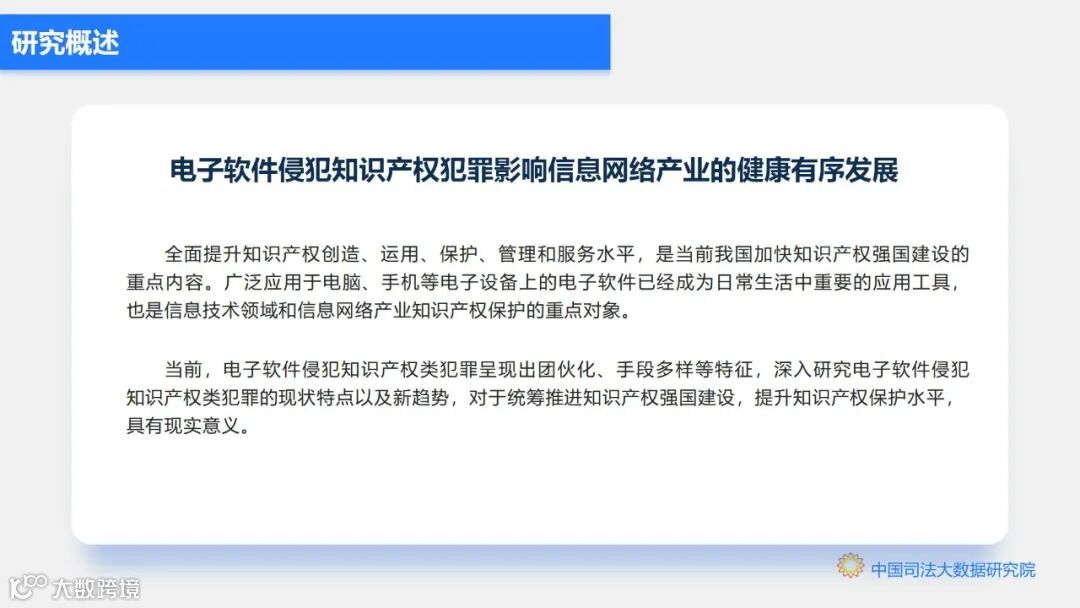 鉴于此,为全面梳理和总结我国电子软件侵犯知识产权类犯罪案件特点和趋势,回应新时代下知识产权犯罪带来的挑战,促进信息网络产业健康有序发展,中国司法大数据研究院联合北京市石景山区人民法院依托中国裁判文书网已公开的裁判文书,对2016年1月1日至2020年12月31日期间全国各级人民法院一审审结且公开的涉电子软件侵犯知识产权类犯罪案件情况进行深入分析,形成《电子软件知识产权犯罪数据分析研究报告(2016.1-2020.12)》(以下简称“报告”)。