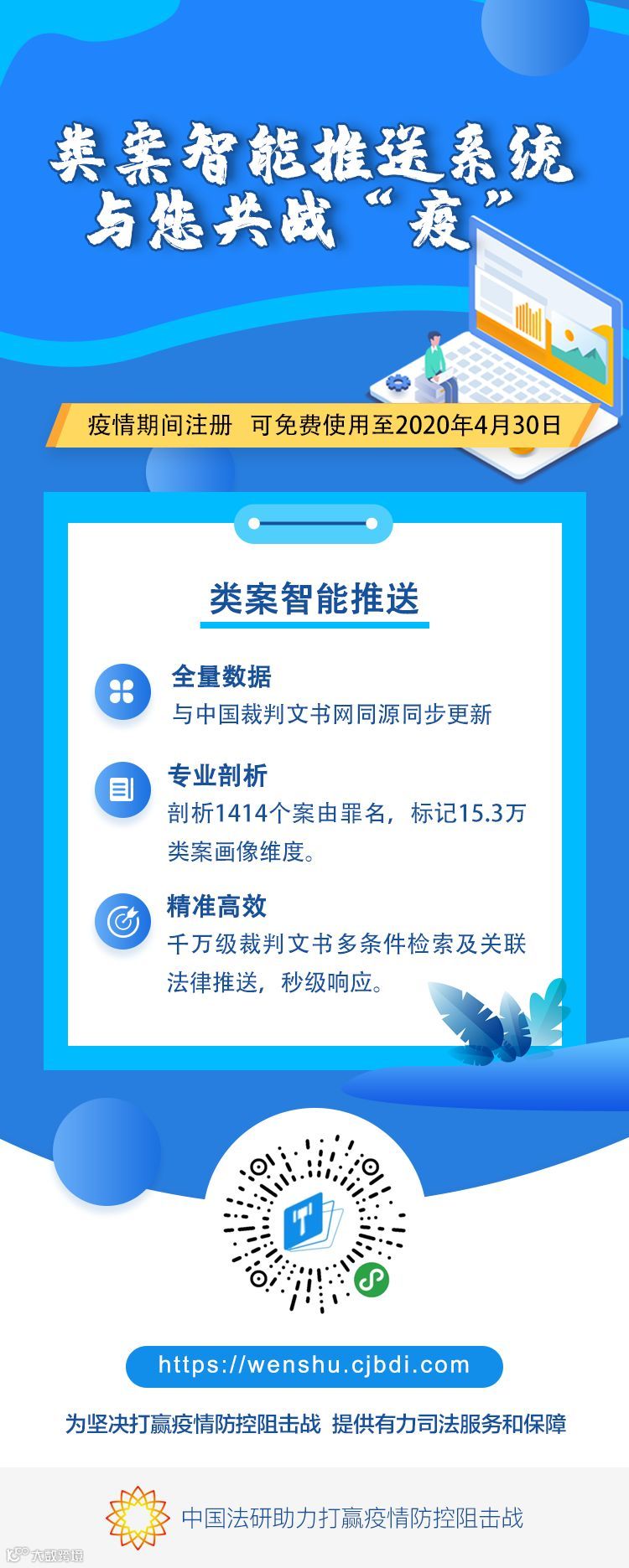 为在疫情防控特殊时期更好服务于司法机关用户、律师用户及公众用户,即日起,中国司法大数据研究院(简称中国法研)免费提供类案智能推送服务、推出诉讼风险评估服务系统(战疫版)及提供疫情防控法律数据库查询服务,助力司法业务工作及公众法律查询正常开展。