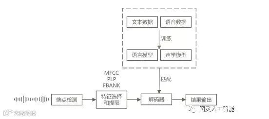 语音信号经过前端信号处理、端点检测等预处理后,逐帧提取语音特征,传统的特征类型包括有MFCC、PLP、FBANK等特征,提取好的特征会送到解码器,在训练好的声学模型、语言模型之下,找到最为匹配的此序列作为识别结果输出。