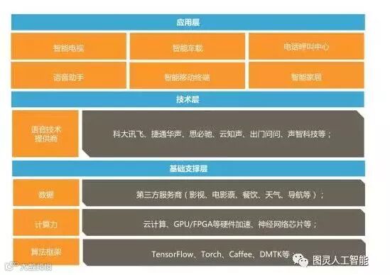 基础层:包含大数据、计算力和算法三块,其中大数据等接入的是相应领域的第三方服务商。机器在识别人类的语音指令后接入、提供相应的服务。诸如影视、电影票、餐饮等;