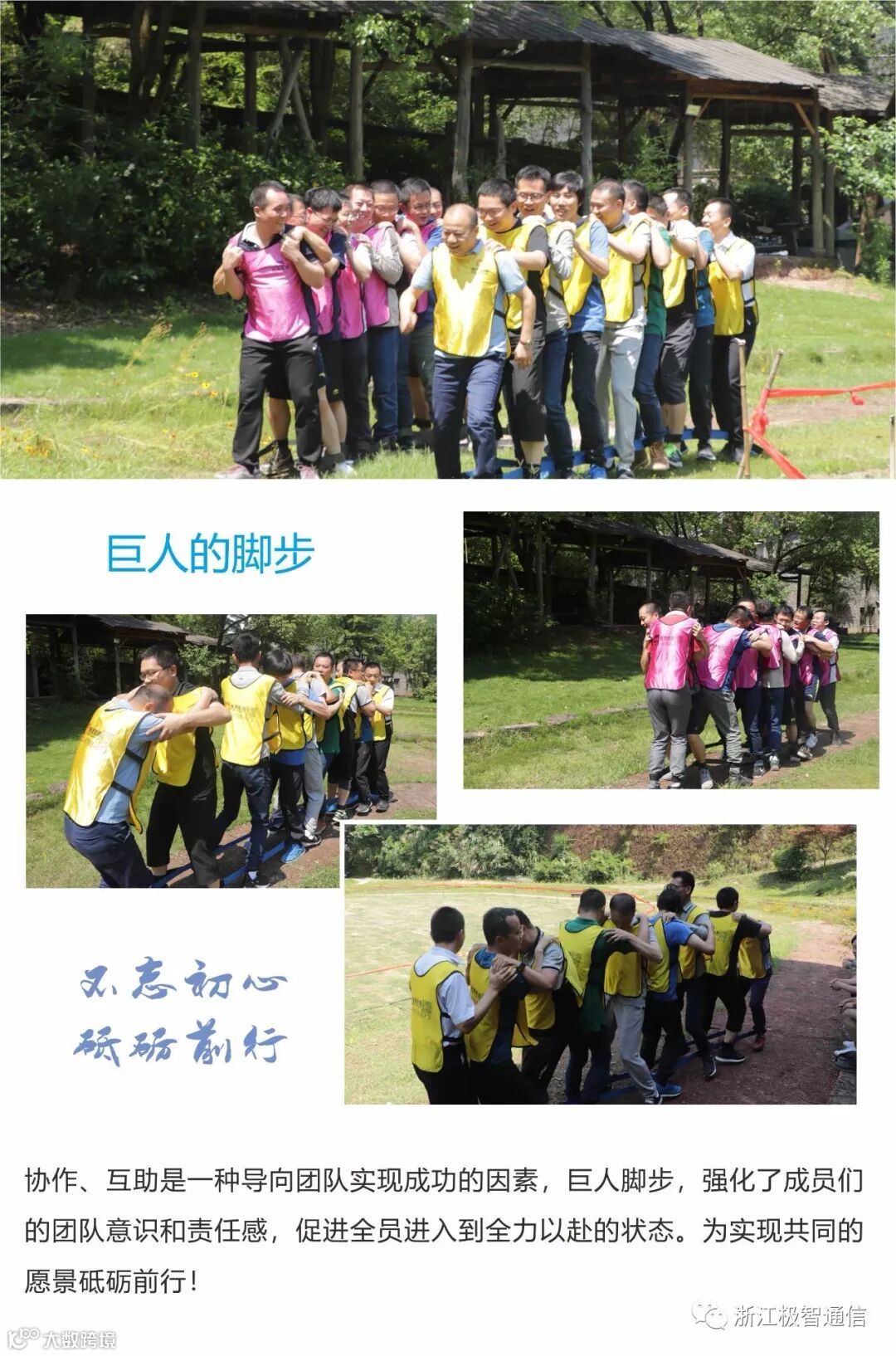 为了加强公司部门之间的凝聚力与战斗力,提升团队的沟通协调能力,2019年6月15日-16日,公司管理层及各部门主管人员参加了主题为“凝心聚力 共创辉煌”的团建拓展活动。经过2天的团建,增进了团队之间的信任感,体会到了工作中沟通协作的重要性,强化了团队意识和责任感。活动中每一位成员不但塑造了最优秀的自己,也打造出了凝心聚力,锐意进取,铸就辉煌的战队,这将对于今后实际工作的展开起到积极的改进和促进的作用,降低沟通成本,提升工作效率,不断向更好的发展阶段迈进!!!以下是拓展训练中的精彩时刻,谨此鼓励全体极智人奋发向上,拼搏进取。