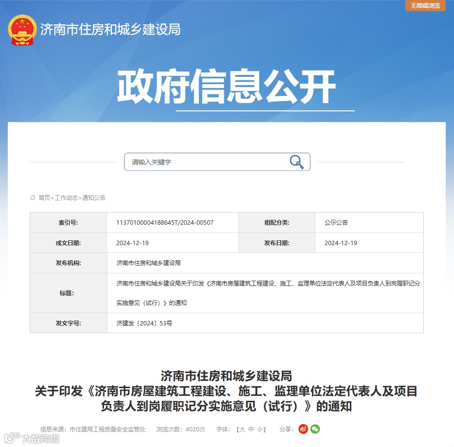 济南市住房和城乡建设局关于印发《济南市房屋建筑工程建设、施工、监理单位法定代表人及项目负责人到岗履职记分实施意见(试行)》的通知