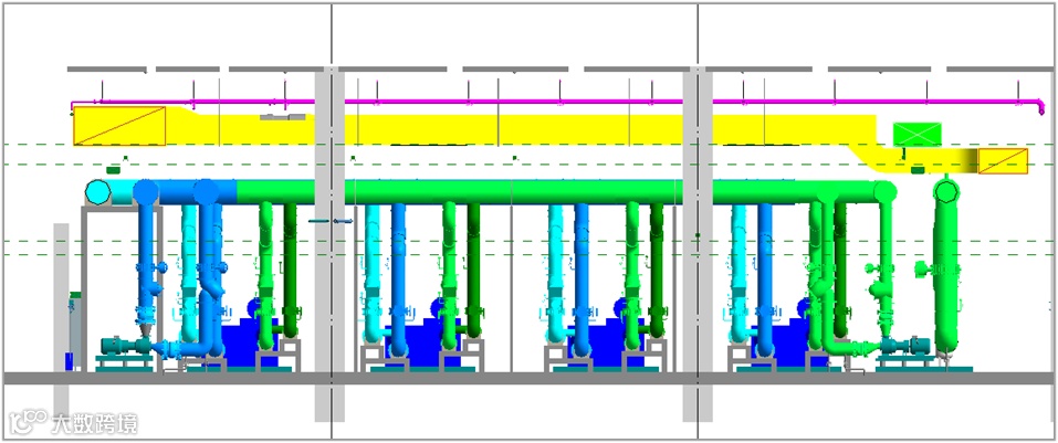 根据冷热源机房的空间高度,将冷热源机房内管线分为4层,最上面第一层为喷淋管(满足上喷要求);第二层为风管,风管均为低平,风口嘴子凸出50mm,在加工中心咬口连接;第三层为线槽灯;第四层为空调水管。层次分明,最下层为空调水管,彰显冷热源机房的重点。