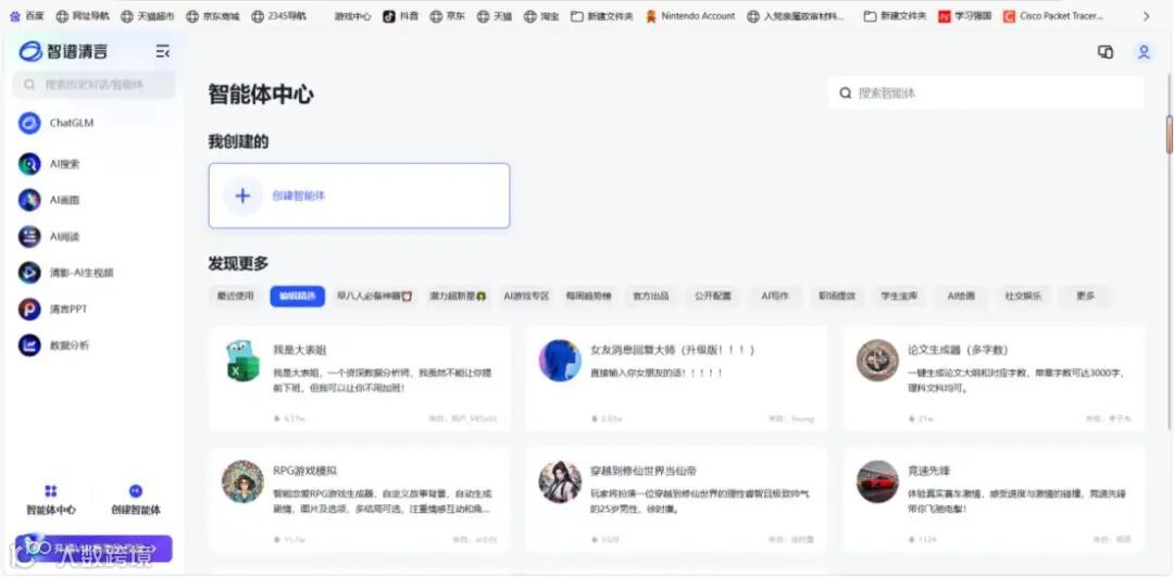 现在有不少平台支持创建智能体,比如字节跳动的扣子Coze、百度的文心智能体平台、腾讯的元器、通义千问和智谱清言等。这些平台都能让你轻松创建智能体,而且不需要编程经验。以智谱清言为例,它的智能体种类丰富,涵盖了各种应用场景,还有很多现成的智能体可以使用。