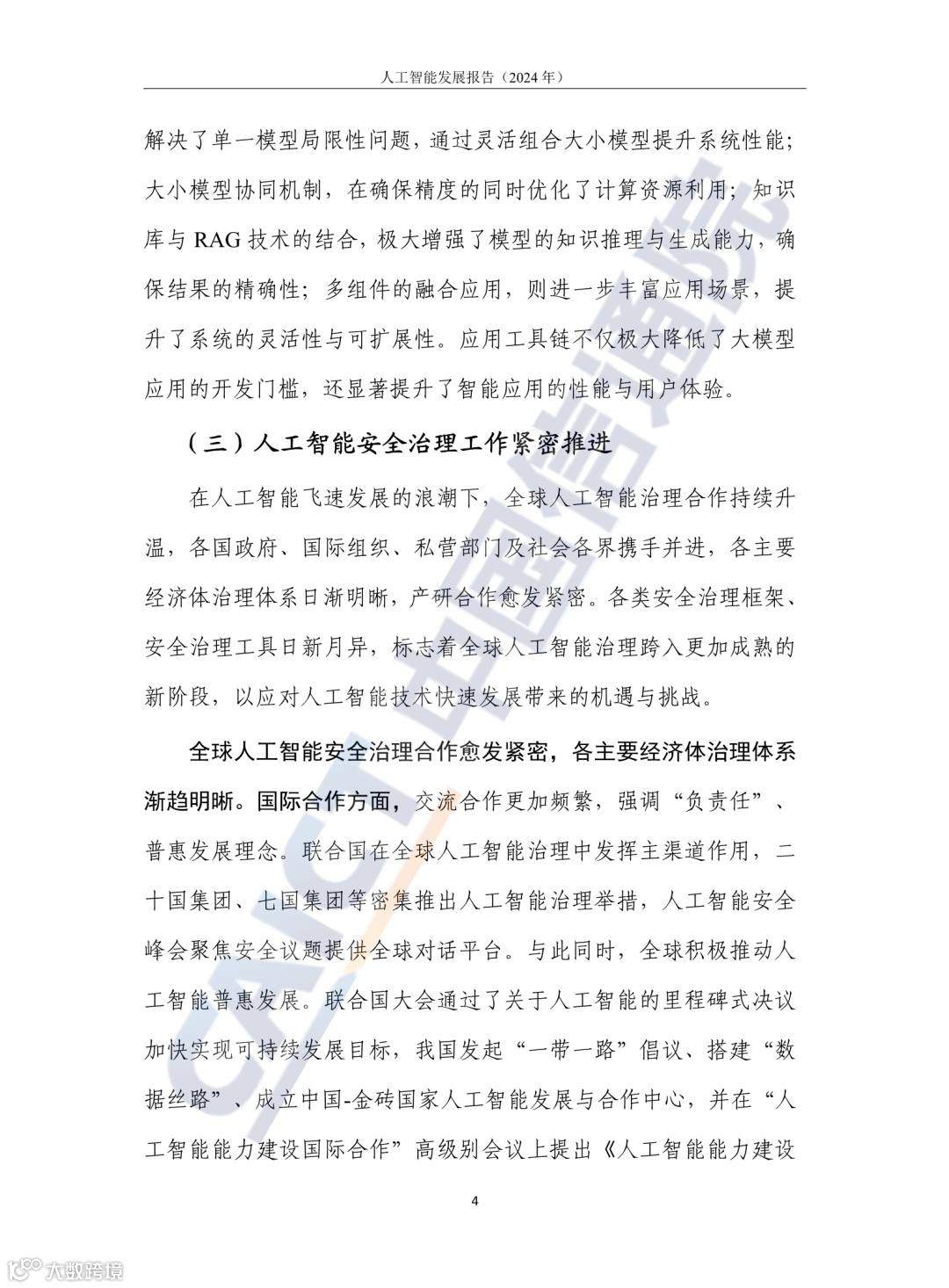 报告中国信息通信研究院发布,旨在总结梳理人工智能技术创新方向、产业升级重点、行业落地趋势和安全治理进展,展望人工智能发展机遇。以下是报告中涉及的主要知识点: