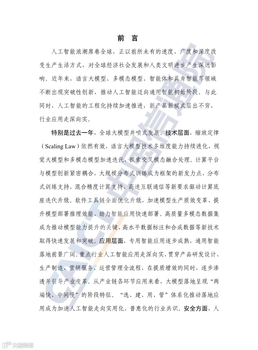 人工智能浪潮席卷全球,正以前所未有的速度、广度和深度改变生产生活方式,对全球经济社会发展和人类文明进步产生深远影响。近年来,语言大模型、多模态模型、智能体和具身智能等领域不断出现突破性创新,推动人工智能迈向通用智能初始阶段。与此同时,人工智能的工程化持续加速推进,新产品新模式层出不穷,行业应用走深向实。