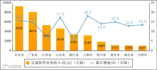 东部地区软件业收入加快增长,中部地区增势突出。1—5月份,东部地区完成软件业务收入35902亿元,同比增长13.5%,增速较1—4月份提高0.5个百分点;中部地区完成软件业务收入2014亿元,同比增长15.6%,增速较1—4月份提高1.4个百分点;西部地区完成软件业务收入4513亿元,同比增长10.7%,增速较1—4月份回落0.3个百分点;东北地区完成软件业务收入810亿元,同比增长13.8%,增速较1—4月份提高0.6个百分点,四个地区软件业务收入在全国总收入中的占比分别为83%、4.7%、10.4%和1.9%。