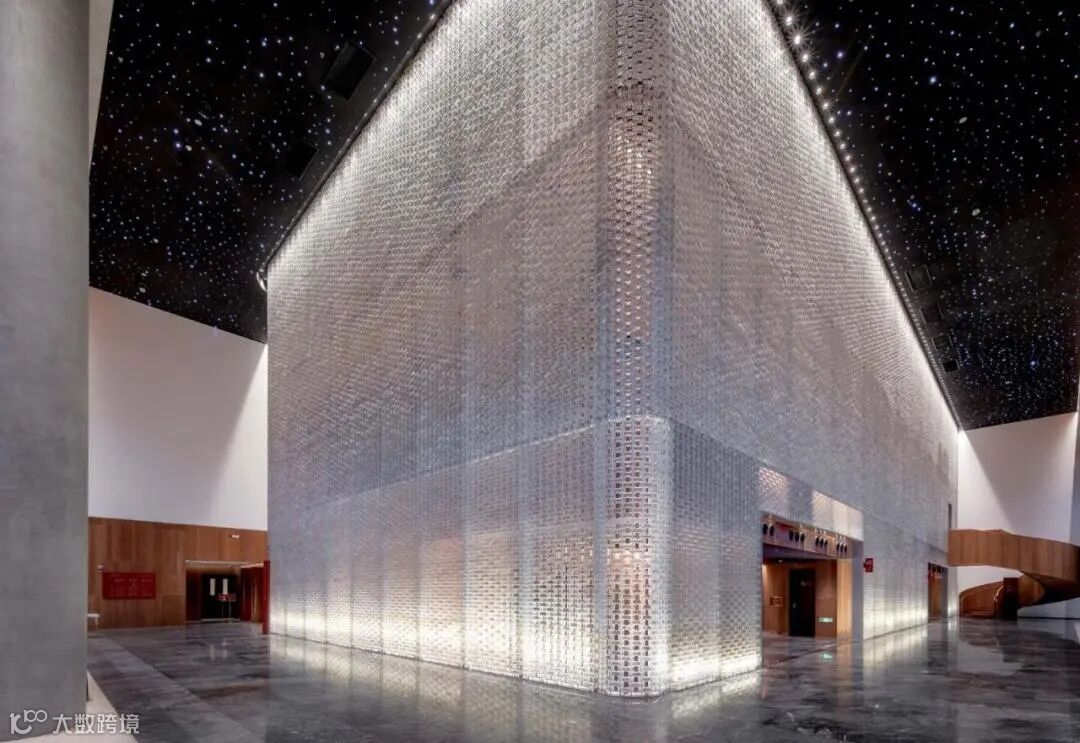 以木色、灰砖色为主调的“曹禺剧场”,整个观众厅围合感好,尺度合宜,稳重、传统和亲切。观众厅由池座和两层楼座组成,内部多种表面凹凸造型与肌理,既提供了微扩散面的声学效果,又与后部深灰色凹凸不平错落有致的“灰砖”GRG墙面一起,形成冷暖与深浅对比,契合北京传统民居四合院的设计元素。