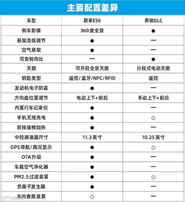 在配置上通过上表,我们可以看到蔚来ES6占据着绝对的优势,在售价相差无几的情况下,蔚来ES6拥有360度全景影像、空气悬架、OTA升级等这样的越级配置,并且还拥有可开启全景天窗、手机无线充电、前排座椅加热、车载空气净化器这样的常用舒适性配置,另外,蔚来ES6还内置了行车记录仪,车主无需二次消费单独购买记录仪。相比较而言,奔驰GLC的配置就没有那么丰富,更多的是品牌溢价。