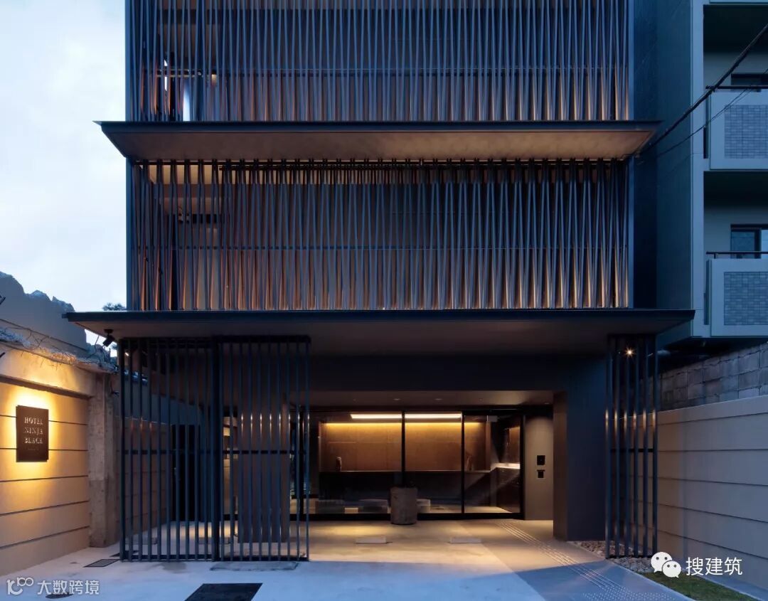 这个建筑是关于“影子”的。这是一家叫“Ninja Black”的酒店。该酒店位于京都市中心,就在京都御所西侧,周围有着房屋、小商店、公寓楼和酒店。京都典型的一块9米宽35米深的土地上建一家5层高有21个房间的小酒店。