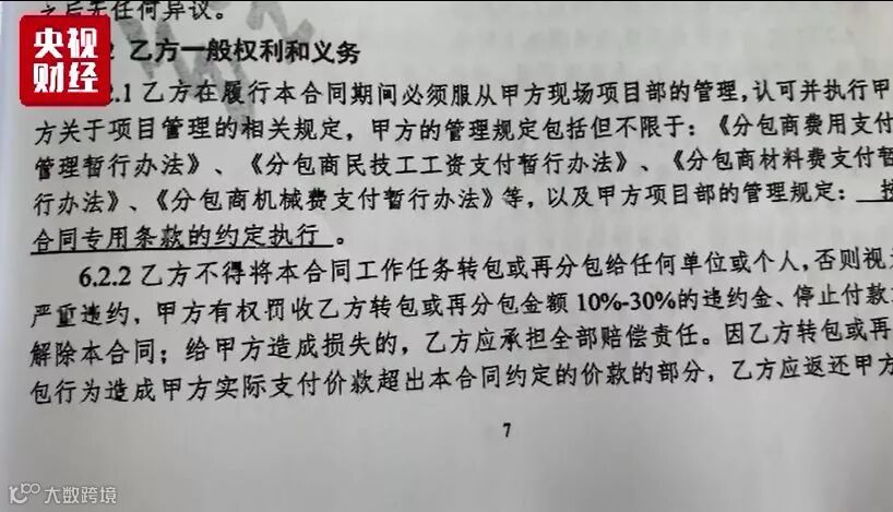 至于永利捷与下游企业继续进行分包的事宜,记者也获得了一份永利捷公司与下游公司签订的合同。而法律专家表示,从永利捷公司往下的一系列转包分包行为均涉嫌违法。
