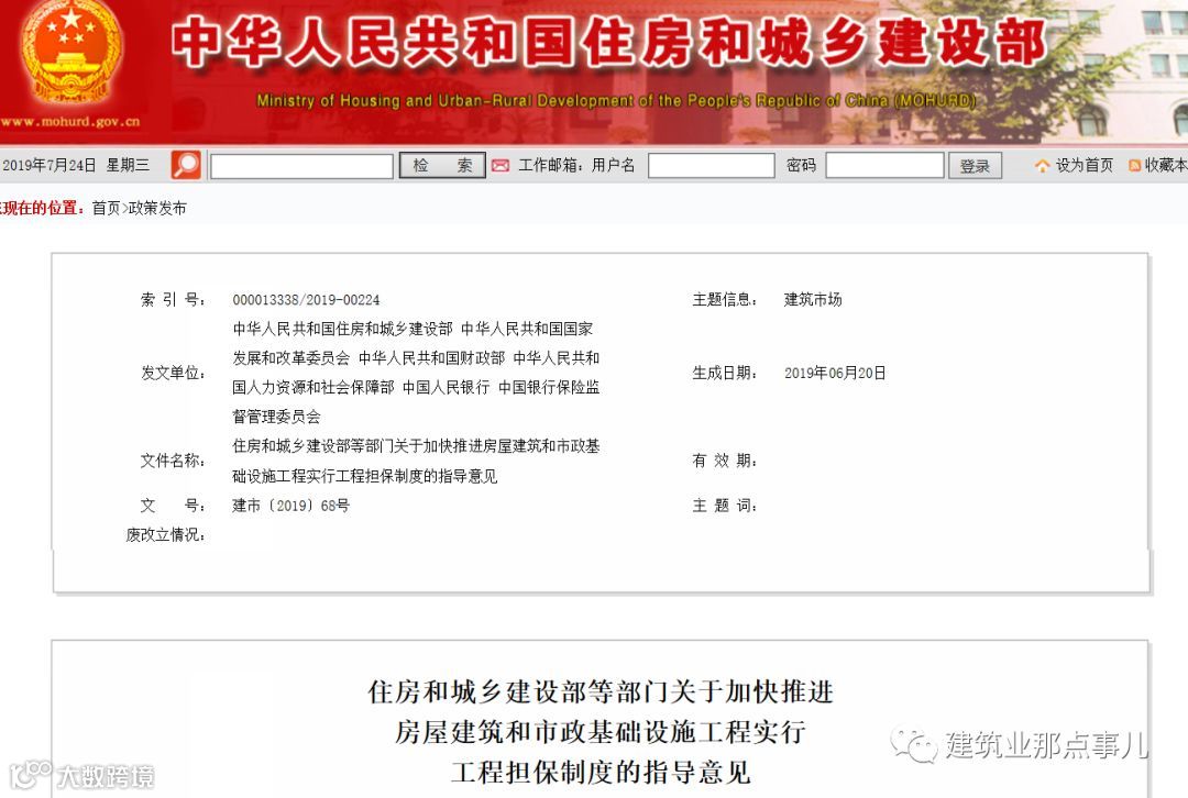2019年7月住建部、发改委、财政部、人社部、人民银行、银保监会六部门联合发布《加快推进房屋建筑和市政基础设施工程实行工程担保制度》(建市【2019】68号)明确提出: