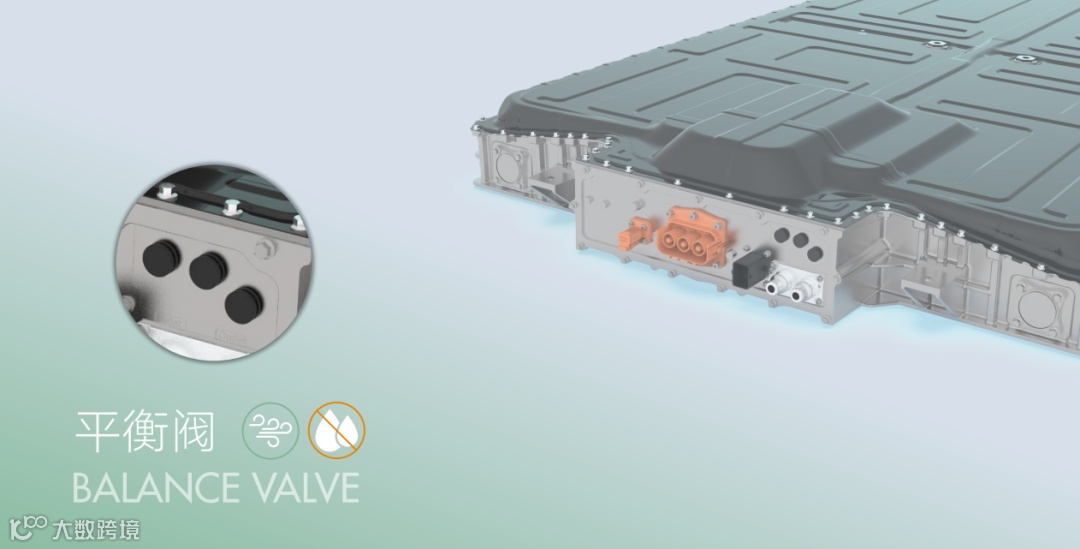 不仅如此,ER6还在电池包箱体上构建起了堵疏结合的排气通道。通过设置“只通气不过水”的平衡阀,来应对电芯热失控时所释放出的大量气体,以达到平衡电池包内外压差的目的。