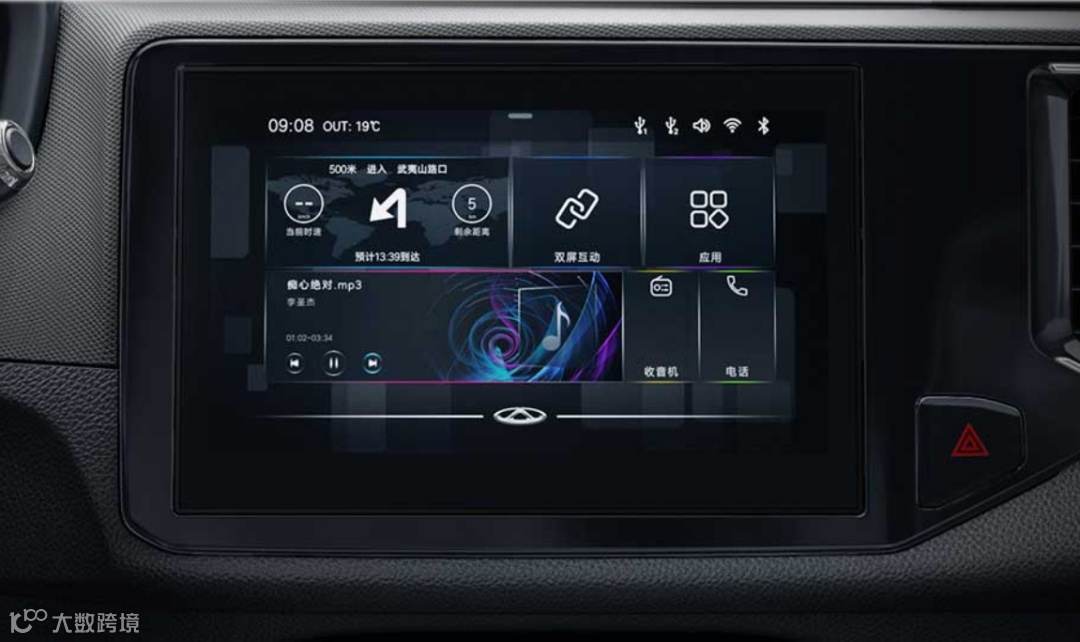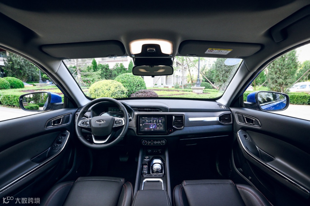内饰精致大气,瑞虎e采用直线与棱角搭配的极简设计勾勒,搭配中控台面板上镶嵌的金属镀铬条装饰,使得整个内饰显得清爽整洁。瑞虎e车内搭载7英寸多功能液晶仪表盘和9英寸中控触摸屏,搭载了全新HMI3.0智能交互系统,支持智能语音、智能互联、智能导航、智能娱乐等几乎涵盖一切生活需求的功能。
