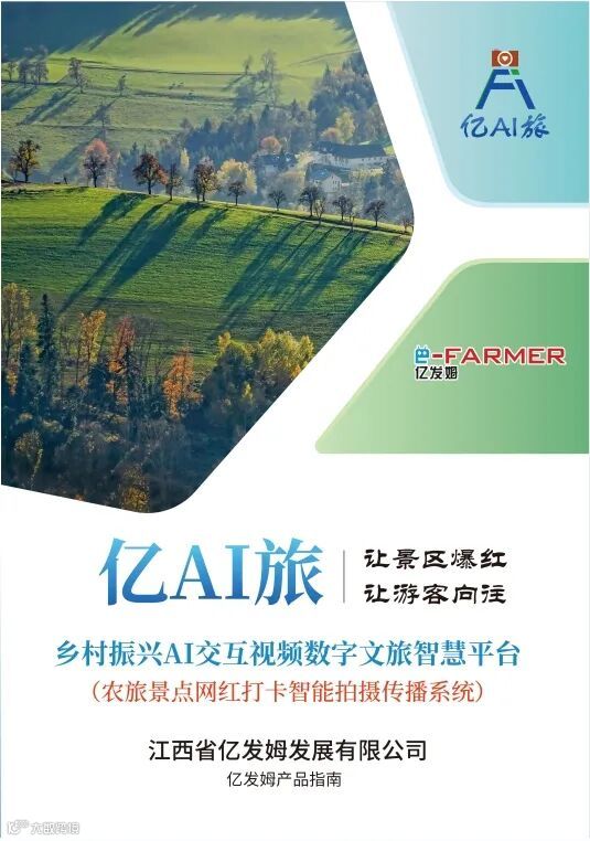 亿AI旅——AI交互视频数字文旅智慧系统,专属快速打造网红农旅景点,为游客提供智能拍照打卡,提供超级便捷的智能分享传播系统,是农旅“爆红景点”的助推神器!由江西省亿发姆科技发展有限公司首创研发,获国家发明专利,属于省级重点研发支持科创项目。