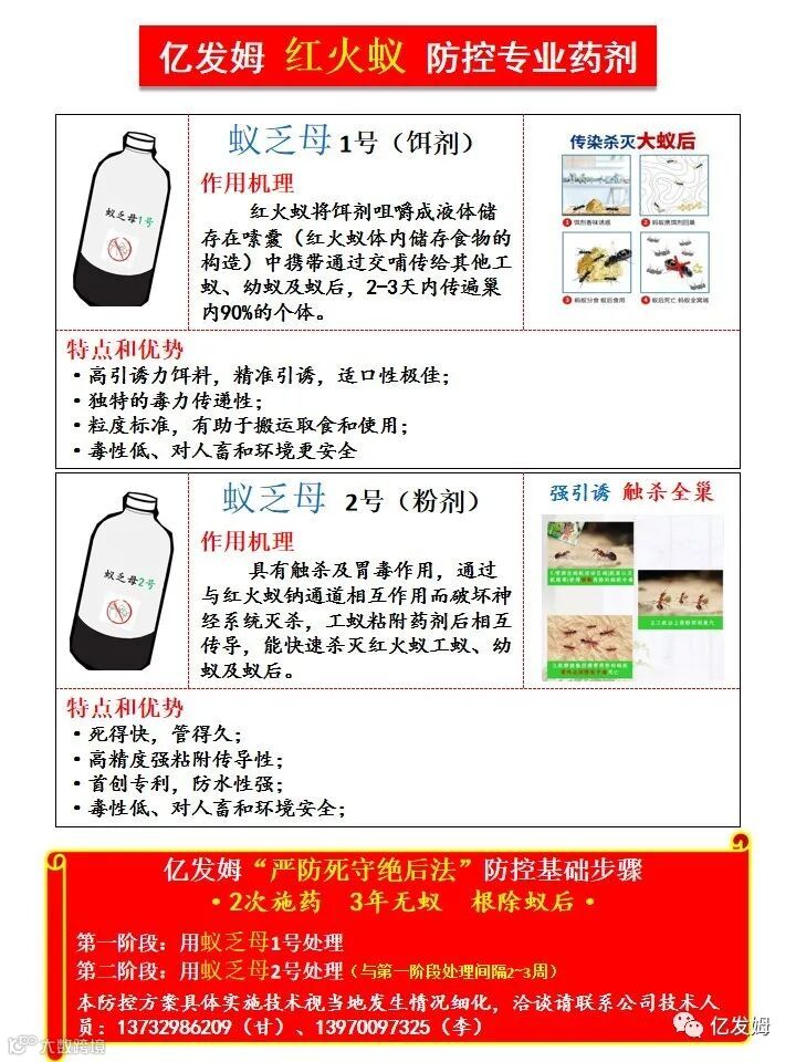 亿发姆设立热线电话,接到红火蚁疫情咨询电话时,及时解疑。接报红火蚁新疫情后,迅速开展疫情紧急调查,并开展红火蚁紧急防控培训,及时控制红火蚁蔓延。