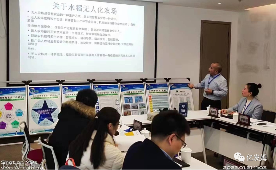 会上,首席传播官曹娜娜汇报演示了公司全自主研发的水稻无人化农场闭环生态系统集成管理平台——e-Farm无人农场系统。