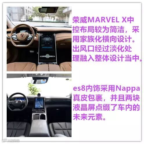 内饰方面,荣威MARVEL X采用浅棕色的配色,尊贵感十足,中控采用了创新的“腾跃式”设计,再加上大尺寸的悬浮中控屏,让内饰整体无时不刻的透露出高端豪华的气息;蔚来es8中控台造型十分简洁,大量的NAPPA真皮包裹,智能驾驶、无线充电等高科技配置遍布了每个细节和角落。