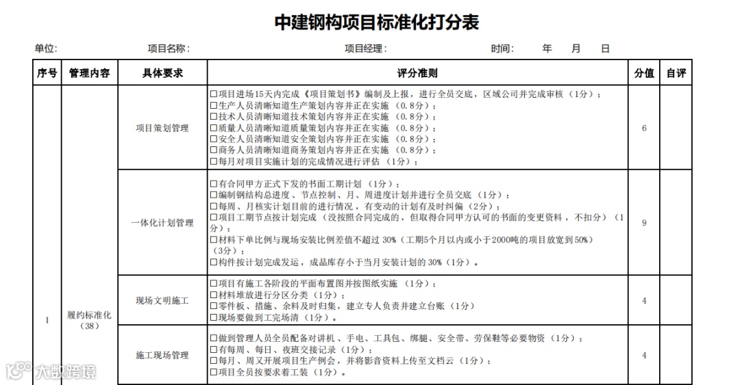 坚持标准引路,以“项目标准化打分表”为抓手,重点围绕生产、技术、质量、CI等十项标准化指标进行考核,督导项目每月自评,中建钢构(西部)总部每季度复评,双重考评助力标准化建设落到实处。