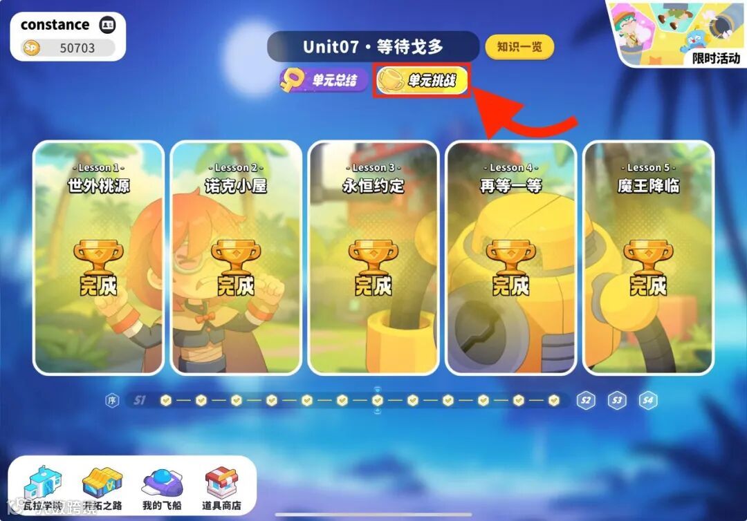 每个单元包含 4 个单词模块、3 个句型模块、1 个语法模块和 1 个发音模块。在单元总结课上,系统会以互动问答和串讲的形式,带领孩子回顾本单元所有知识点。比如在单词模块,会通过 “词义匹配” 游戏,让孩子将 “journey”“trip”“adventure” 等易混淆单词与对应的释义、场景准确匹配;在语法模块,会重新梳理 “否定祈使句” 的结构(Don't + 动词原形)和用法,结合课堂情境中的例句帮助孩子加深理解。