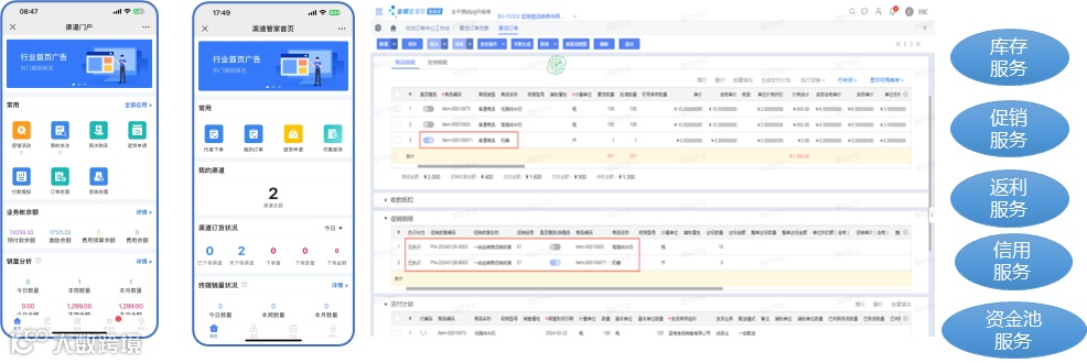 渠道订货协同,货物流动不止于订单需求的传递:多端多角色多层级门户,强大订单处理中心,可配置的营销服务,全透明的资金池,无缝的业财融合