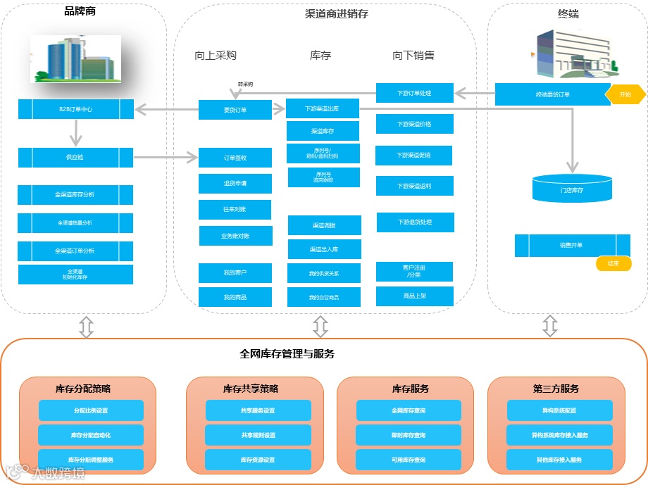 共享货物流动成果,让周转更高效:全局库存可视化服务、完善的渠道进销存管理。