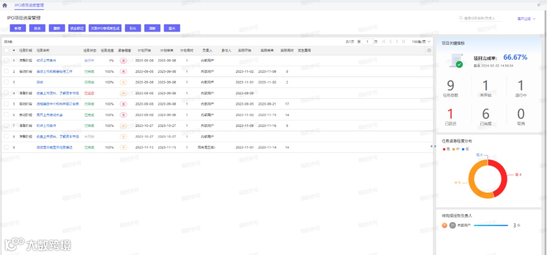 支持IPO主题分析看板,提供问题汇总看板;支持6大主题报表,提供IPO视角下主题分析,分资产、负债、收入、成本费用、内控、关联交易多维度多角度的数据合规分析;支持IPO合规指引管理,实现对概念说明、IPO关注重点、备查资料、相关法规的知识管理;支持IPO风险标签管理,实现对IPO合规规则引擎的前台管理和满足企业自定义规则需求。