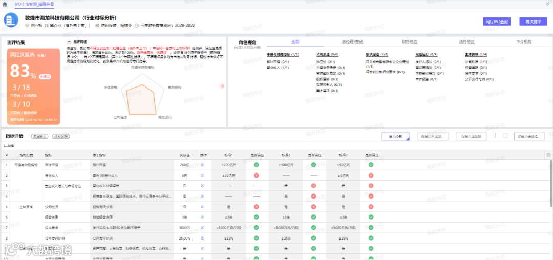 ② 同一板块下的多套标准进行了指标结构化提炼,实时动态测评,并给出智测结果,形成智测报告,帮助拟IPO企业发现资格硬伤和最优上市适用标准。
