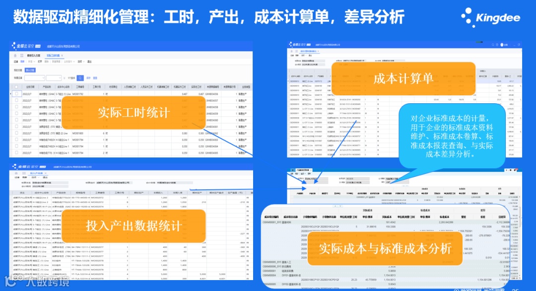 事中,从成本要素来划分成本监控的对象,对于材料成本,主要是监控BOM定额是否超标使用;对于人工,根据生产工艺标准工时,及时跟踪分析人工效率是否按照即定标准执行;对于制造费用,通过预算管理工具,按目标费率实施费用的控制,费用执行率需要与生产进度相匹配,及时分析费用超标的原因。