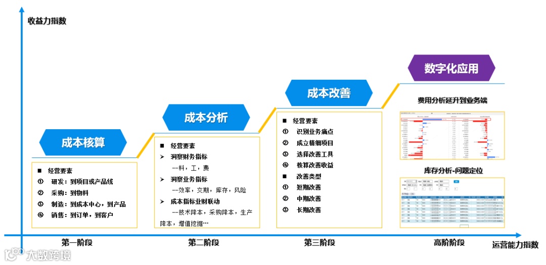 目前而言,大多数企业还处于成本核算阶段,如何提升成本精算能力是当下需要解决的问题,而算不清的背后是企业业务端的管理不规范导致的,在管理基础规范的情况下,才能真正提升成本核算能力。反过来说,一个企业能把成本算得清楚,意味着企业的管理水平已经迈上了一个台阶,有了成本核算数据的支撑,数据赋能管理价值提升才能进行。