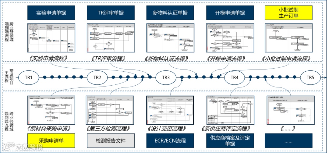 搭建多层结构化流程,明确各职能部门在研发过程中的职责,实现任务与跨部门工作流的联动,以项目WBS为主线,设置项目执行过程中各种跨部门的端到端子流程,实现流程自动驱动。针对项目组中的研发、采购、财务、生产、质量等各部门人员,实现流程驱动和消息提醒,提高项目沟通效率。充分利用一体化平台特性,直接针对研发项目任务发起采购申请、小批试制等流程,实现跨业务领域的流程对接。