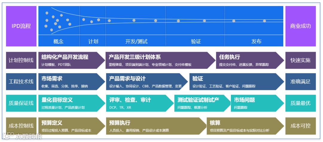 产品研发不仅仅要攻克技术难关,更应构建以产品在市场上实现商业成功为目标的产品研发管理体系,才能使企业长期拥有不断开发出优秀产品的能力。完备的产品研发体系,它涵盖了产品从市场需求、设计、采购与制造、产品上市、运营服务、到退市的产品全生命周期过程,更重要是以产品赢得市场成功为终极目标。体系需要用完备的流程固化下来,使得研发各个节点的目标与流程顺应公司产品商业成功的主航道,并使得开发出爆款产品不再是一个偶然,而是“从偶然到必然”。