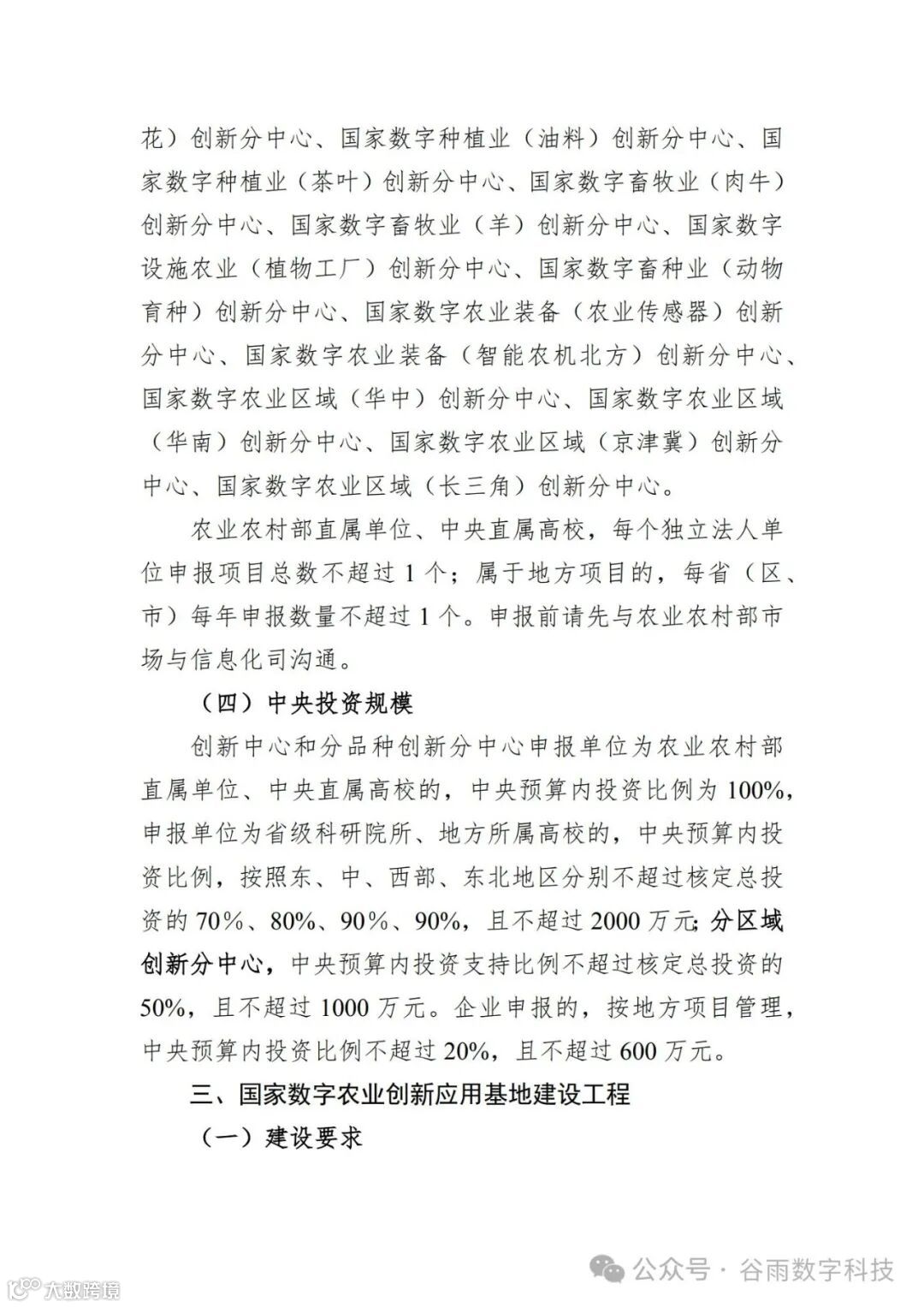 花) 创新分中心、 国家数字种植业(油料)创新分中心、 国 家数字种植业(茶叶)创新分中心、 国家数字畜牧业(肉牛) 创新分中心、 国家数字畜牧业(羊)创新分中心、 国家数字 设施农业(植物工厂)创新分中心、 国家数字畜种业(动物 育种) 创新分中心、 国家数字农业装备(农业传感器)创新 分中心、 国家数字农业装备(智能农机北方)创新分中心、 国家数字农业区域(华中)创新分中心、 国家数字农业区域 ( 华南) 创新分中心、 国家数字农业区域(京津冀)创新分 中心、 国家数字农业区域(长三角)创新分中心。 农业农村部直属单位、 中央直属高校, 每个独立法人单 位申报项目总数不超过 1 个; 属于地方项目的, 每省 ( 区、 市) 每年申报数量不超过 1 个。 申报前请先与农业农村部市 场与信息化司沟通。 ( 四) 中央投资规模 创新中心和分品种创新分中心申报单位为农业农村部 直属单位、 中央直属高校的, 中央预算内投资比例为 100% , 申报单位为省级科研院所、 地方所属高校的, 中央预算内投 资比例, 按照东、 中、 西部、 东北地区分别不超过核定总投 资的 70 %、 80% 、 90 %、 90% , 且不超过 2000 万元; 分区域 创新分中心, 中央预算内投资支持比例不超过核定总投资的 50% , 且不超过 1000 万元。 企业申报的, 按地方项目管理, 中央预算内投资比例不超过 20% , 且不超过 600 万元。 三、 国家数字农业创新应用基地建设工程 ( 一) 建设要求