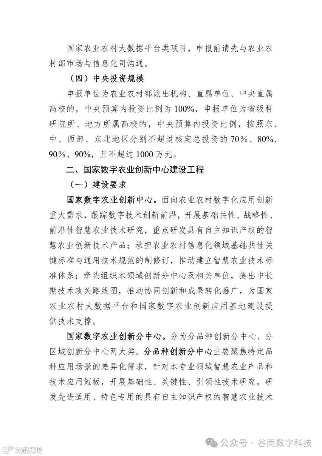 国家农业农村大数据平台类项目, 申报前请先与农业农 村部市场与信息化司沟通。 ( 四) 中央投资规模 申报单位为农业农村部派出机构、 直属单位、 中央直属 高校的, 中央预算内投资比例为 100% , 申报单位为省级科 研院所、 地方所属高校的, 中央预算内投资比例, 按照东、 中、 西部、 东北地区分别不超过核定总投资的 70 %、 80% 、 90 %、 90% , 且不超过 1000 万元。 二、 国家数字农业创新中心建设工程 ( 一) 建设要求 国家数字农业创新中心。 面向农业农村数字化应用创新 重大需求,跟踪数字技术创新前沿,开展基础共性、战略性、 前沿性智慧农业技术研究, 重点研发具有自主知识产权的智 慧农业创新技术产品; 承担农业农村信息化领域基础共性关 键标准与通用技术规范的制修订, 推动建立智慧农业技术标 准体系; 牵头组织本领域创新分中心及相关单位, 提出中长 期技术攻关路线图, 推动协同创新和成果转化推广, 为国家 农业农村大数据平台和国家数字农业创新应用基地建设提 供技术支撑。 国家数字农业创新分中心。 分为分品种创新分中心、 分 区域创新分中心两大类。 分品种创新分中心 主要聚焦特定品 种应用场景的差异化需求, 针对本专业领域智慧农业产品和 技术应用短板, 开展基础性、 关键性、 引领性技术研究, 研 发先进适用、 特色专用的具有自主知识产权的智慧农