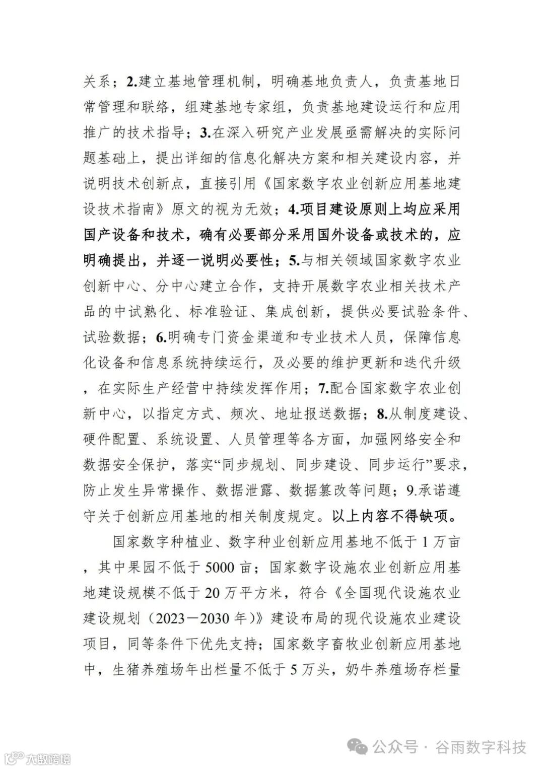 关系;2. 建立基地管理机制, 明确基地负责人, 负责基地日 常管理和联络, 组建基地专家组, 负责基地建设运行和应用 推广的技术指导;3. 在深入研究产业发展亟需解决的实际问 题基础上, 提出详细的信息化解决方案和相关建设内容, 并 说明技术创新点, 直接引用 《 国家数字农业创新应用基地建 设技术指南》原文的视为无效;4. 项目建设原则上均应采用 国产设备和技术, 确有必要部分采用国外设备或技术的,应 明确提出, 并逐一说明必要性;5. 与相关领域国家数字农业 创新中心、 分中心建立合作, 支持开展数字农业相关技术产 品的中试熟化、 标准验证、 集成创新, 提供必要试验条件、 试验数据;6. 明确专门资金渠道和专业技术人员, 保障信息 化设备和信息系统持续运行, 及必要的维护更新和迭代升级 , 在实际生产经营中持续发挥作用;7. 配合国家数字农业创 新中心, 以指定方式、 频次、 地址报送数据;8. 从制度建设、 硬件配置、 系统设置、 人员管理等各方面, 加强网络安全和 数据安全保护, 落实 “ 同步规划、 同步建设、 同步运行 ” 要求, 防止发生异常操作、 数据泄露、 数据篡改等问题;9. 承诺遵 守关于创新应用基地的相关制度规定。 以上内容不得缺项。 国家数字种植业、 数字种业创新应用基地不低于 1 万亩 , 其中果园不低于 5000 亩; 国家数字设施农业创新应用基 地建设规模不低于 20 万平方米, 符合《全国现代设施农业 建设规划 ( 2023 - 2030 年)》 建设布局的现代设施农业建设 项目, 同等条件下优先支持; 国家数字畜牧业创新应用基地 中, 生猪养殖场年出栏量不低于 5 万头, 奶牛养殖场存栏量