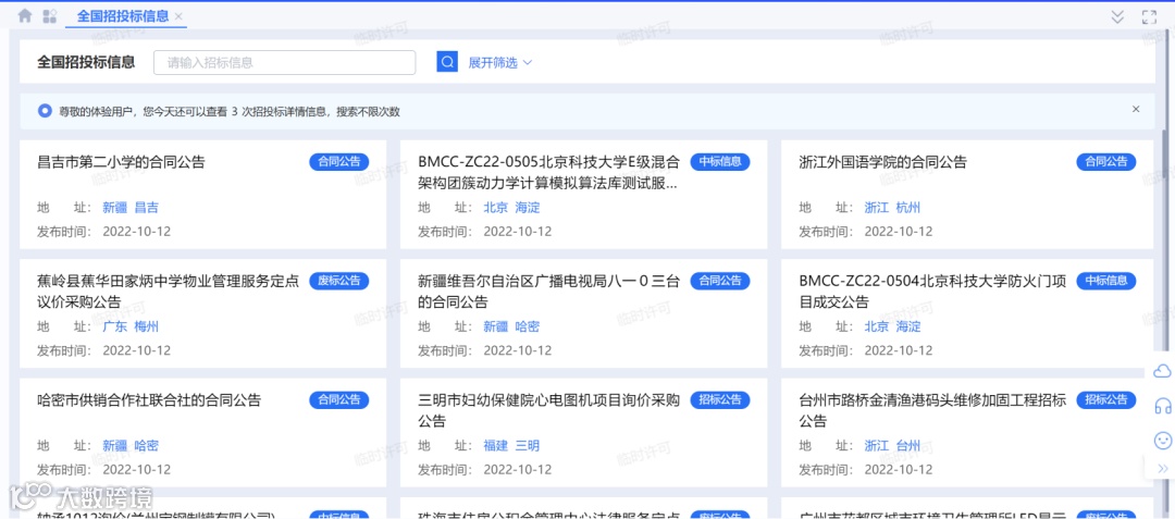 对接全国招投标信息,基于供需智能推荐,帮助您采购拓源,发现优质供应商。同时帮助企业快速获取外部招投标需求,扩大销售商机;支持客户定制化招投标信息推送服务,如收藏关注的招投标商机、订阅招投标关键字等,系统自动推送,规避招投标商机的遗漏。