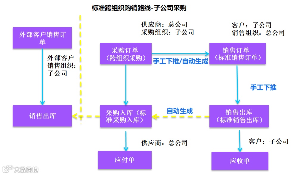 集团间分子公司相互经常发生购销业务,例:子公司向总公司要货,分公司需录入采购订单、入库单、应付单,总公司要录入销售订单、出库单,应收单,还要往来对账,效率低下,要花大量时间减少错误的发生。