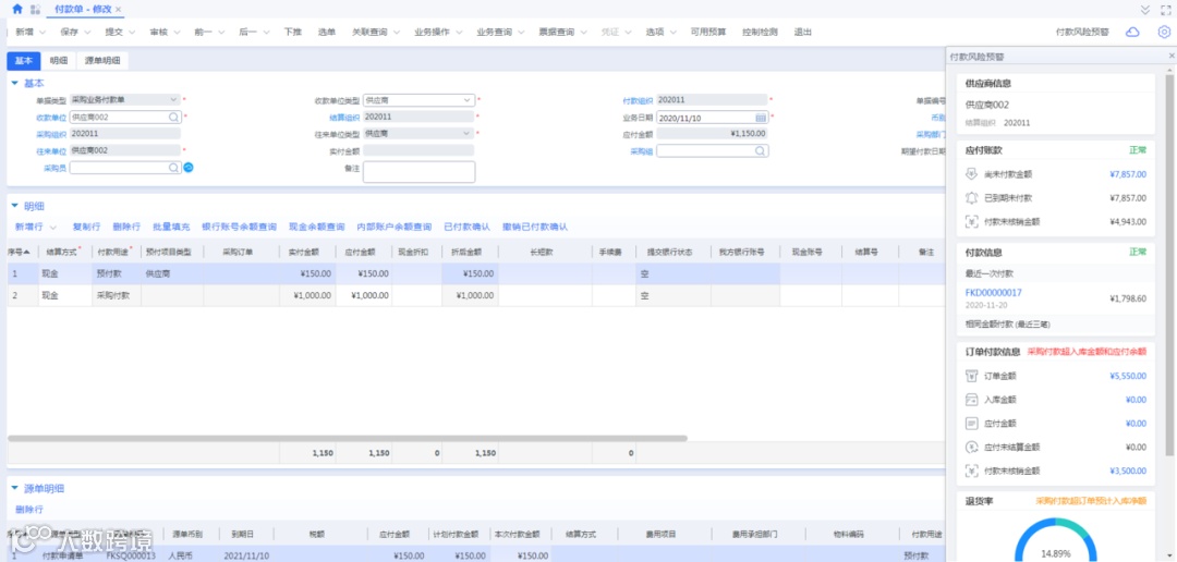 其中8.0中,我们需要强调的是,将风控再次强化,为数据智能服务重要的三大类型之一,风险管理也是企业优先建立的能力。例如在企业内部,资金是企业重要的资源之一,要确保其安全性,可用性和效率性,为企业增加保护盾,新特性将对资金风险识别贯穿应收,采购,付款,费用多个业务层面,并对识别出的风险进行提前预警,让风险遁于无形。