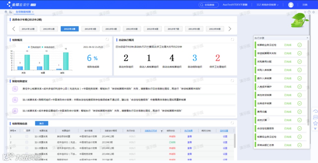 一键式批量启动,通过智能核算、智能检测、自动结账,结账过程透明化,且无需等待,自动完成存货结账的全流程。同时利用了智能化流程指引和预置的数据检测模型,能及时发现异常,给予优化建议,提升核算准确度和存货结账效率。