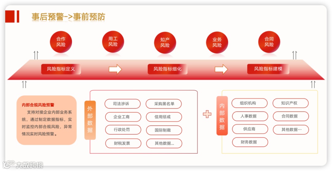 面向管理者打造数字化、智能化企业合规风控监管系统。融合工商、司法、行政、制裁、知产、采购黑名单等数据,构筑坚实数据底座。以信息化为手段,以“穿透式”方式,全面了解企业合规、风控管理体系建设及运行情况,动态掌握企业经营管理过程中各类风险的识别、预警、应对处置及后续整改情况,实现事前预警、事中监管、事后整改的在线闭环管理。结合重大法律纠纷案件管理、经营合规风险、内控与风险管理等,对企业经营状况进行全面分析,更好服务管理者监管并辅助决策。