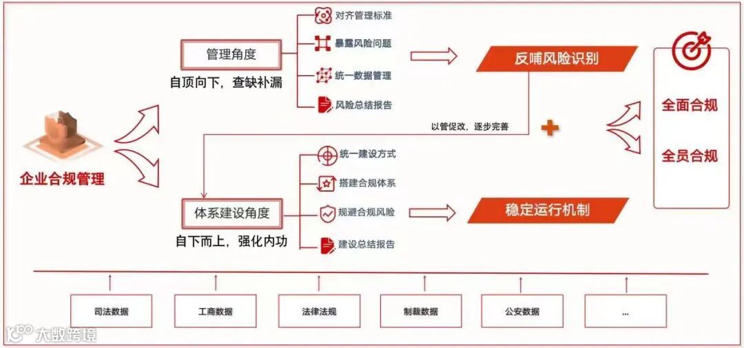 数智化企业合规建设整体思路,是从管理监督与体系建设两个维度出发,自上向下查漏补缺与自下向上逐步完善的有机循环。一方面结合监督管理要求与实际合规建设需求,构建企业合规风险监管体系,对齐管理标准、制定风险清单等,自动识别被监管企业运行风险;另一方面,基于自身的合规管理目标与外部监管要求,结合内外部大数据能力,建设风险知识体系、自动预警模型等,构建企业合规风险管理体系。形成风险反哺与体系完善的良好循环,以达到全面合规、全员合规目标。