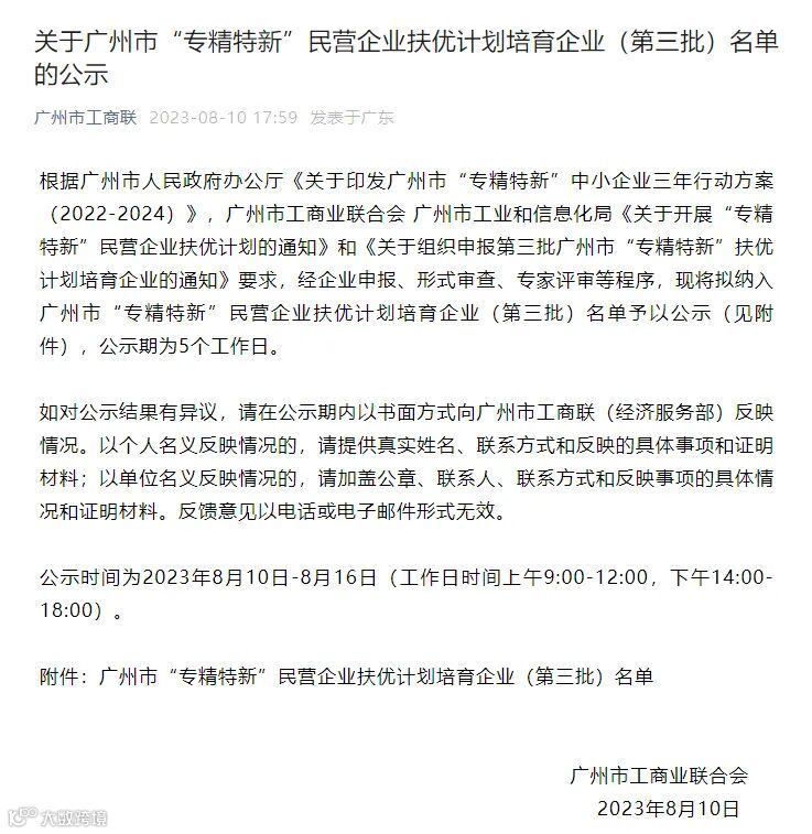 8月10日,广州市工商业联合会、广州市工业和信息化局联合公示了广州市“专精特新”民营企业扶优计划培育企业(第三批)名单,广州市智慧农业服务股份有限公司(下称“智慧农业”)凭借专业化、精细化和创新能力等指标特征成功入选。
