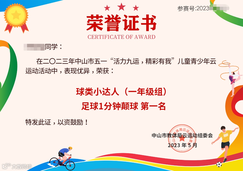 2、获奖学生均可获得由组委会颁发的电子荣誉证书,落款及印章为“中山市教体局云运动组委会”;进入“我的证书”可查看并自行下载打印电子证书。