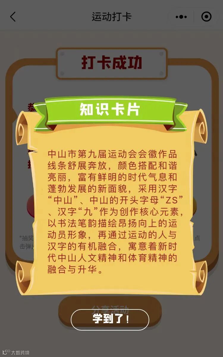 学生每次打卡完毕,均可获得一张“知识卡片”,除融入中华传统体育文化知识、多学科知识和体育健康知识等知识外,还特别为孩子们普及本届中山市运会知识,让体育小白更懂“中山九运”!![]()