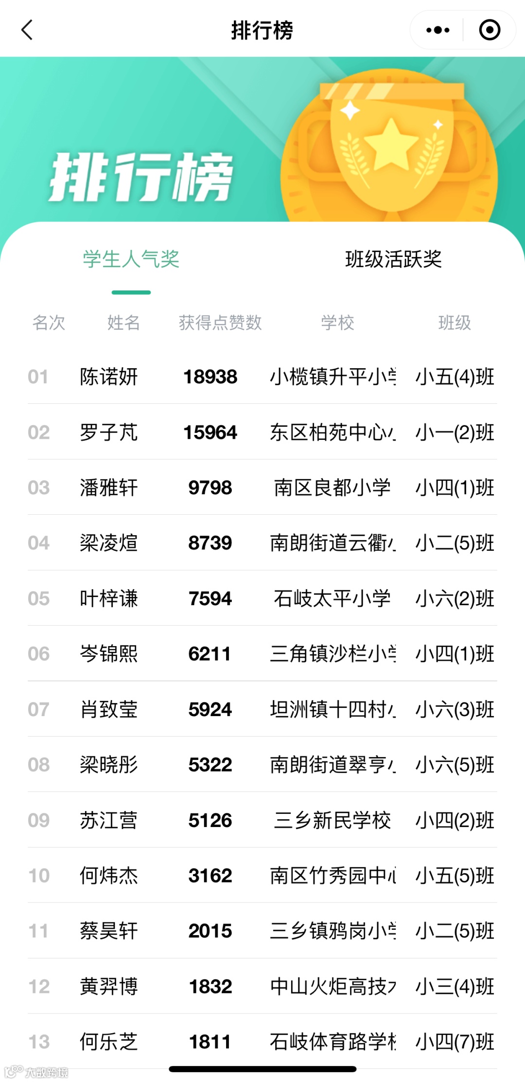 学生人气排行榜 班级活跃排行榜